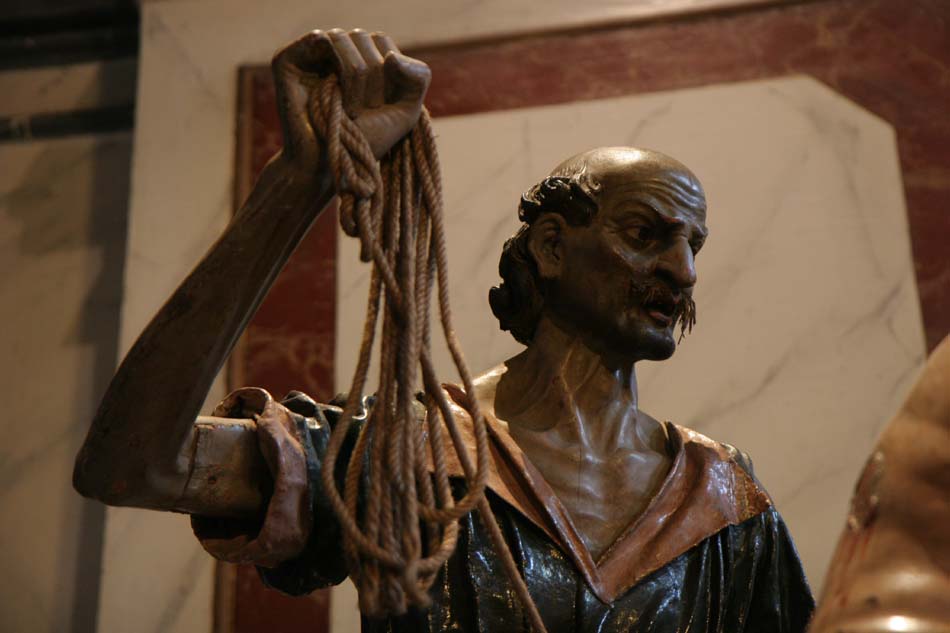 Mercoledì santo: questi gruppi di statue popolarmente vengono chiamate 'i Giudei' perchè si rimane veramente colpiti e inpressionati dai brutti ceffi che sono rappresentati accanto a Gesù, come ad esempio questo flagellatore