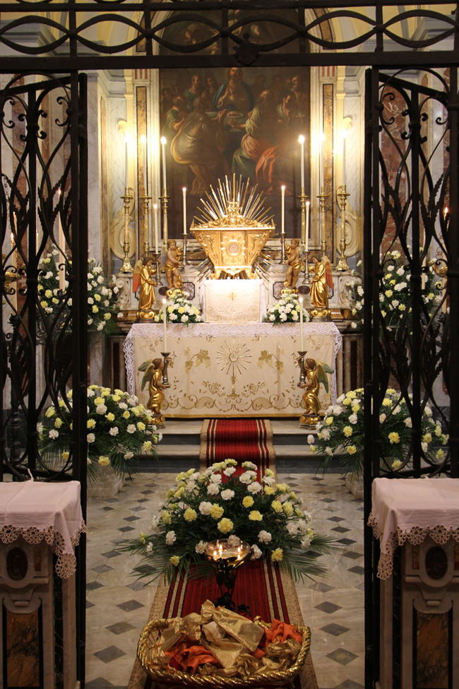 Giovedì Santo 2012. Altare del Sacramento. Si nota il cesto con i 'fioretti' quaresimali dei nostri bambini (foto Sacchi)